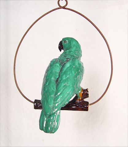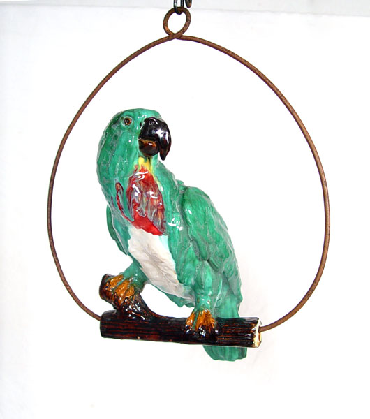 MAJOLICA GLAZE EARTHENWARE PARROT ON METAL SWING: Parrot measures 16'' high, 19'' high overall excluding chain. Note crazing, chip on tail.