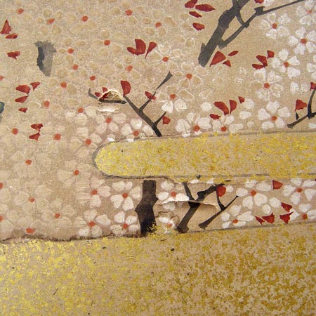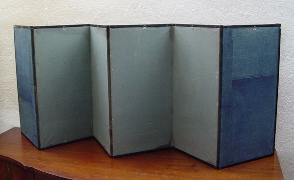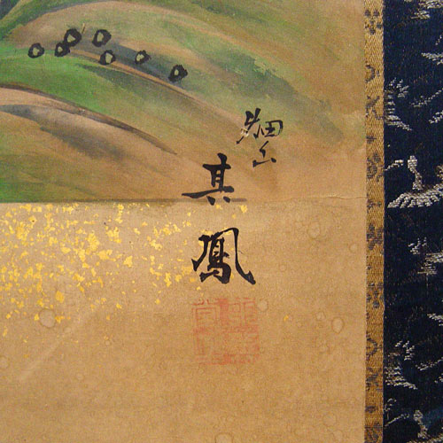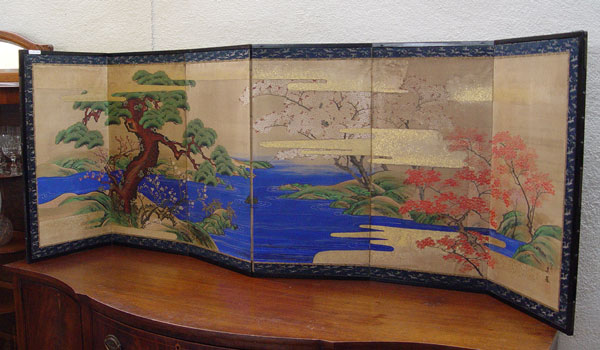 EARLY JAPANESE SILK FOLDING SCREEN: 6 panel screen. Ink and vivid colors on silk, signed. 7'long, 27''h. Please note several nicks.