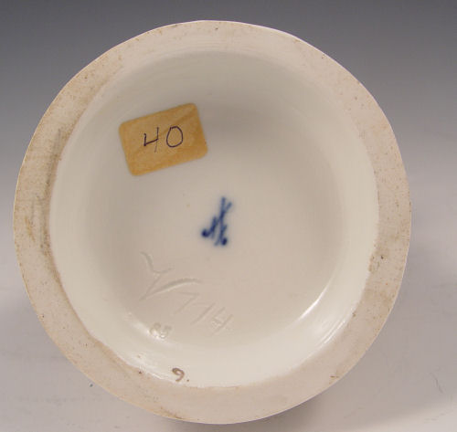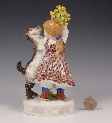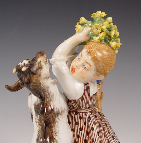 MEISSEN FIGURE OF YOUNG GIRL WITH GOAT: Blue cross swords under glaze, incised V114, impressed 85. 7'' tall, 3 5/8'' dia.