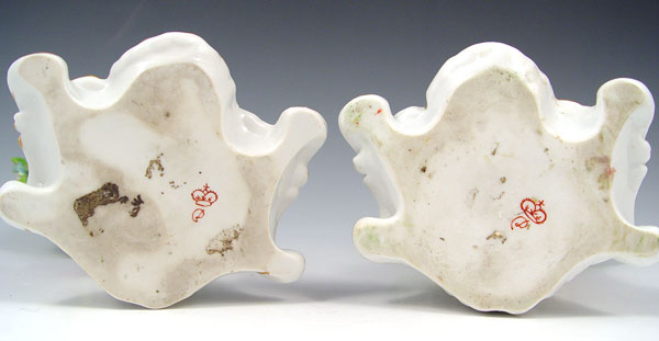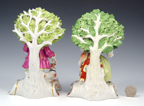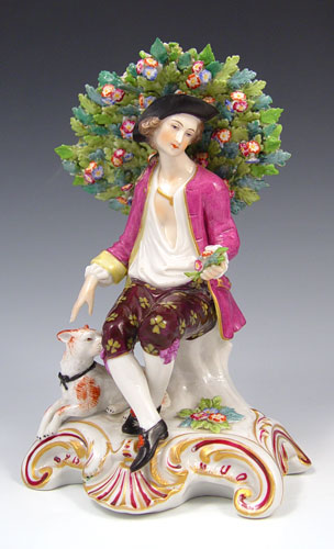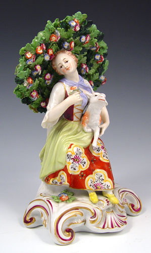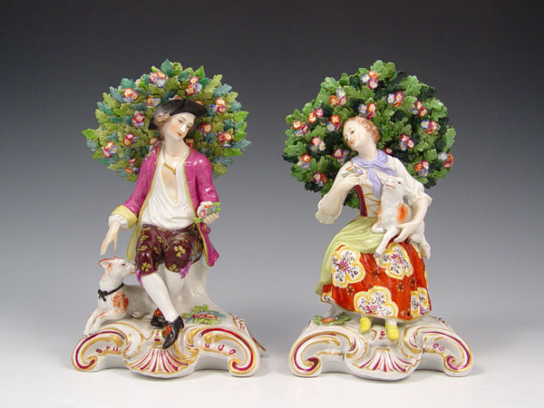 PAIR OF OLD DERBY FIGURINES: Girl with lamb, boy with dog, on scrolled bases. Red crown and D mark. 7'' tall.