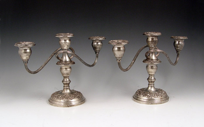 S. KIRK & SONS REPOUSSE STERLING 3 LIGHT CANDELABRUMS: Repousse floral design, 3 light convertible to single light. Weighted sterling base. Believe to have been lacquered at some time. Measures 7 3/4'' high x 11 3/4'' wide.