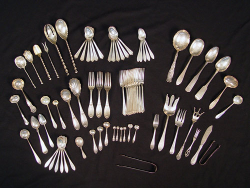 LARGE MIXED ESTATE STERLING & COIN FLATWARE: 32 sterling pieces by assorted makers and patterns, almost all pieces monogrammed. Highlights include 11 dinner forks & 12 spoons by Watson, Davis & Galt serving pieces, Lunt hand hammered sugar tongs, Wallace, Whiting pieces, and too many other to mention. 13 coin silver highlights include 3 Lowell & Senter forks, Lowell & Senter sugar scoop, F & H knife & fork and other assorted pieces. 45 pieces total. Also included are 3 pieces unknown metal content. Approx. 61.8 troy oz. sterling, 14.5 troy oz coin.