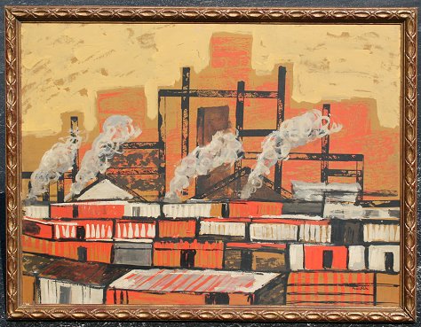 URBAN INDUSTRIAL SCENE, OIL/MASONITE: 32'' x 44 1/2'', signed Franklin, possibly George, carved gold frame with wear, 35'' x 46''.