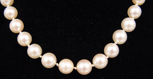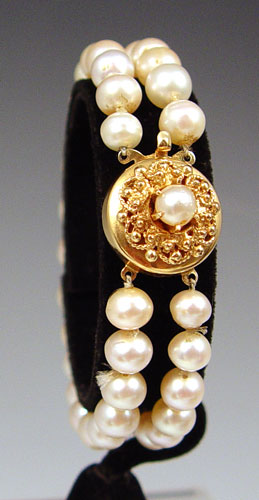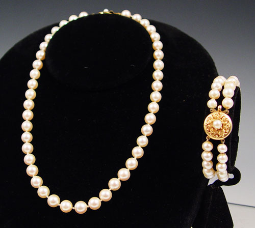 CULTURED PEARL NECKLACE AND BRACELET: Necklace is a 16'' strand of 8.00 mm off round cultured pearls. Cream with rose overtone, blemished, medium luster, 18K yellow gold clasp. BRACELET is a 7'' double strand of 7.00 mm off round and potato shaped cultured pearls, white with rose overtone, very blemished, medium luster. 14K yellow gold fancy medallion clasp.