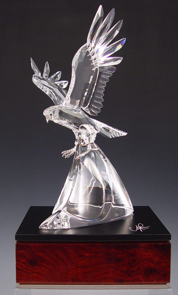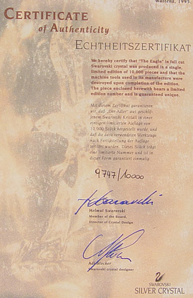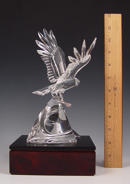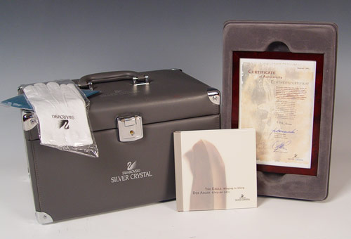1995 LIMITED EDITION SWAROVSKI EAGLE IN CASE: 1995 limited edition eagle figurine with sterling silver feet and wood base. Eagle measures 9'' high excluding base. Note one feather will need to be reglued back on. Comes with case, COA and paperwork. #9747/10000. Case measures 9'' high x 14 1/2'' x 9 3/4''.