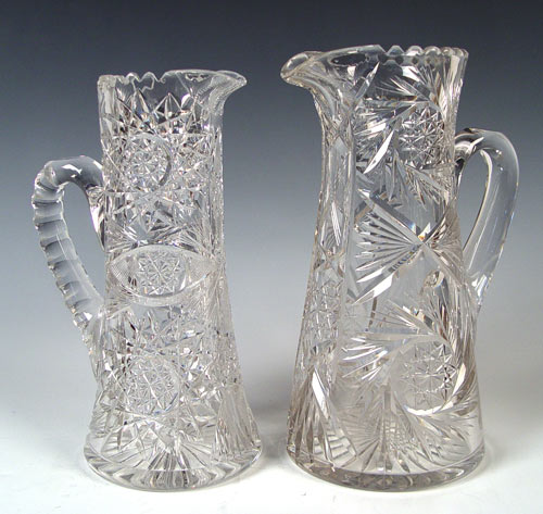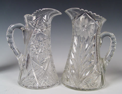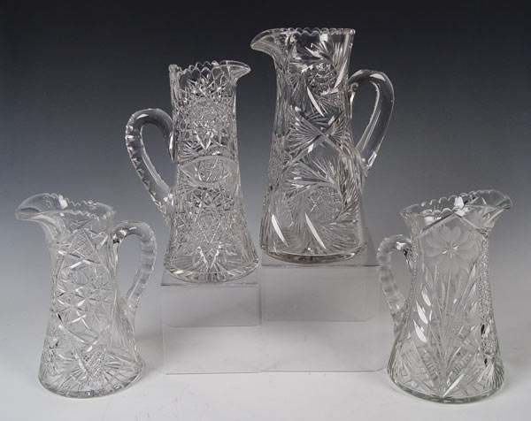 4 AMERICAN BRILLIANT CUT GLASS PITCHERS: 9 1/2'' TO 11 1/2'' tall.