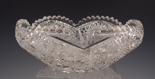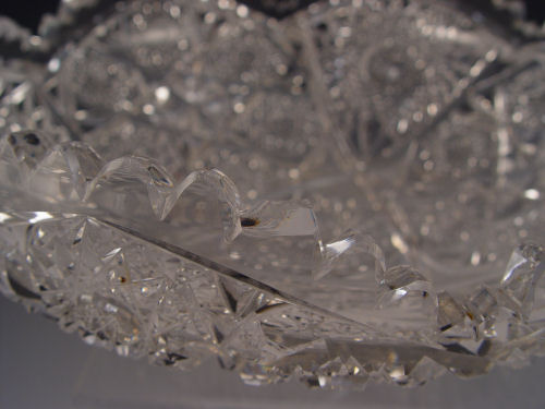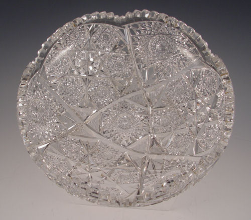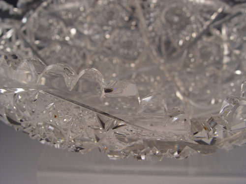 AMERICAN BRILLIANT CUT GLASS SCALLOP RIM BOWL: In an usual form, 10'' high x 3 3/4'' dia. Note scratched base, clam shell chip