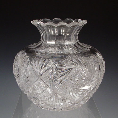 CLARKE AMERICAN BRILLIANT CUT GLASS FLOWER CENTER VASE: Scallop rim vase, please note small fleck under rim. 6'' high x 7'' dia. overall