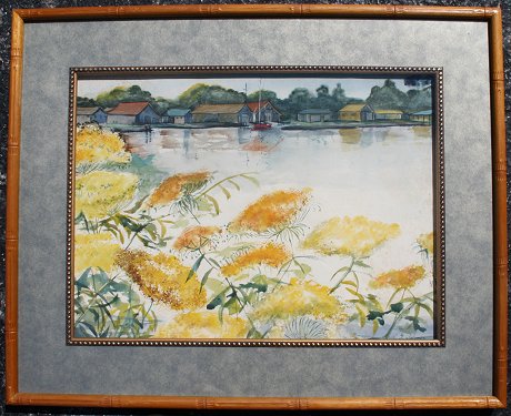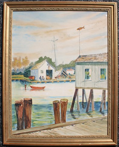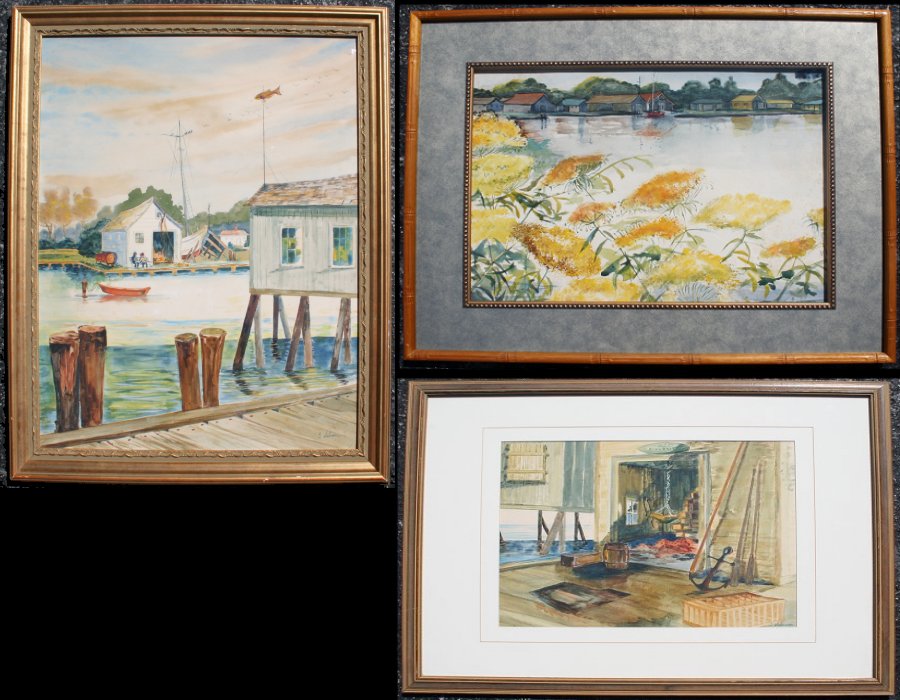 3 PC G SALOMON WATERCOLOR LOT: To include, Dockside Fisheries Scene, sight size 15'' x 19'', fine contemporary frame, 26 1/2'' x 32''; Coastal Harbor Scene from the shore, sight size 16 1/2'' x 22 1/2'', faux bamboo frame, 25'' x 31''; Dockside Scene with Figures, sight size 29 1/2'' x 23 1/2'', contemporary frame, 34'' x 29''. All pieces are signed, sold as is.