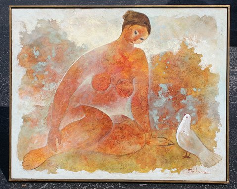 ILLEGIBLY SIGNED NUDE WITH DOVE: OIL/C, 31 3/8'' x 39'', framed 32'' x 40''. Condition - Please note puncture in center of canvas.