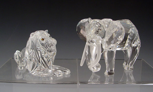 SWAROVSKI CRYSTAL LION AND ELEPHANT: 2 pieces to include 1) Lion with frosted tip of tail. 2 1/2'' high x 5'' long. 2) Elephant with frosted tusks. 3 1/4'' high x 4''. No boxes.
