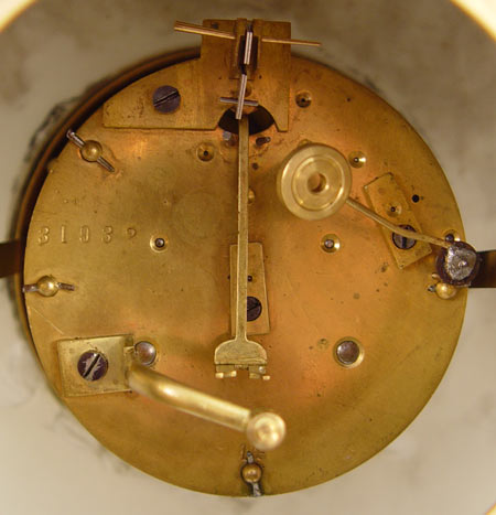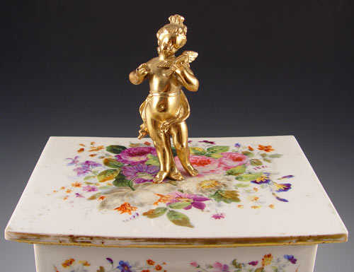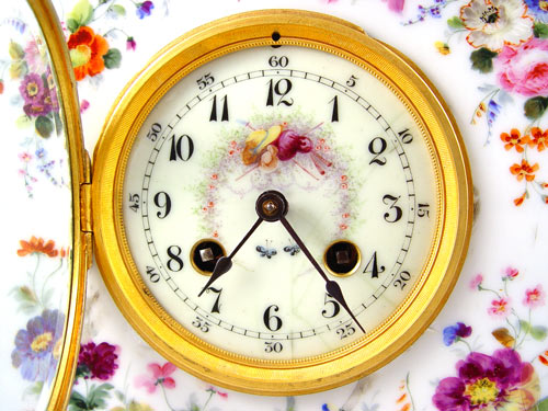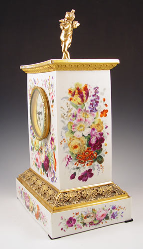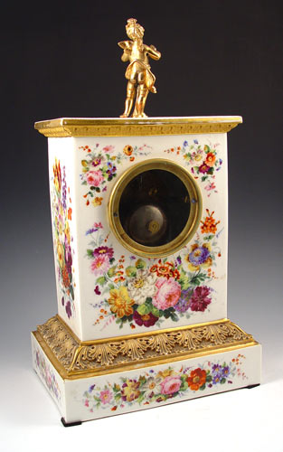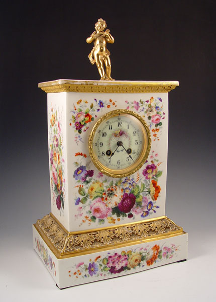 OLD PARIS PORCELAIN CASE CLOCK: Hand painted porcelain case with colorful floral design and gold painted accents, note loss of gold paint. Gilt metal cherub finial. Key and pendulum mechanism unsigned. Hand painted porcelain face with Arabic numerals, hour and minutes. Beveled glass bezel. Note hairlines on face. Measures 17 1/2'' high x 9 5/8'' x 6 3/4''. Key and pendulum in office.