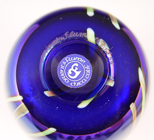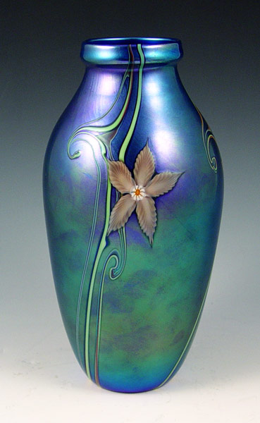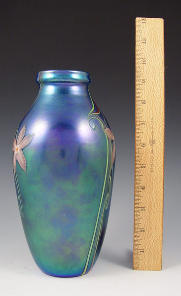 ORIENT & FLUME IRIDESCENT ART GLASS VASE: Rich blue, paper label and etched ''Orient & Flume 1880S1559'', 9''.