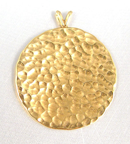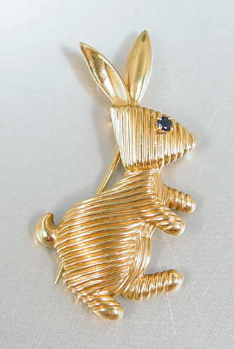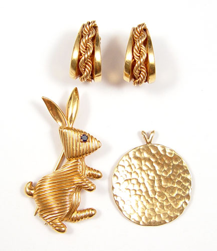 3 PIECE ESTATE LOT GOLD EARRINGS, RABBIT BROOCH AND HAMMERED PENDANT: 1) 14K yellow gold hammered disc pendant, approx. 1 1/4'' diameter. 2) 14K yellow gold Rope hoop earrings. Weight for 14K is 23.8 grams. 3) 18K yellow gold stylized rabbit fur brooch. Weight for 18K is 11.6 grams.
