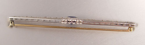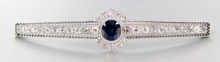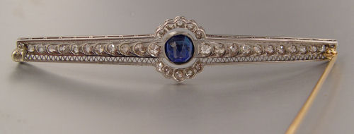 PERIOD BIGELOW KENNARD & CO. PLATINUM 3 CT SAPPHIRE BROOCH: One oval shaped, bezel set, native cut sapphire, approx. 3.00 Ct., Rated SI2 in clarity (Type II), slvB in Hue, 6-7 in Tone and 4 in Saturation. With 32 old European round cut diamonds, approx. total 2.00 Ct., rated SI in clarity, and I-J-K in color. The diamonds are bead set. Filigree and miligrain detail. Approx. 3 1/4'' in length. Signed: Bigelow, Kennard & Co. (Boston). Weight: 12.0 grams. Est. $3500/4000**