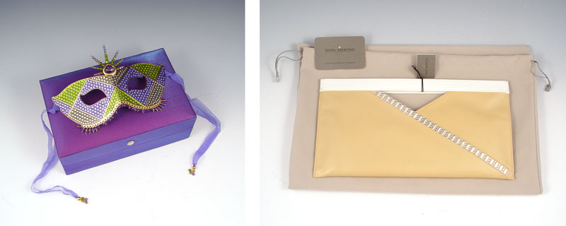 SWAROVSKI MASK AND DANIEL SWAROVSKI PARIS PURSE: To include 1) Swarovski masquerade mask with purple & green crystals in original box with certificate. Mask measures 7 1/4'' across. Box measures 3'' high x 8 3/4'' x 5 3/4''. 2) Daniel Swarovski leather handbag with crystal accents in original box. Suggested retail $575. Purse measures 5 1/4'' x 12''. Box measures 3 1/4'' x 17 1/2'' x 10''.