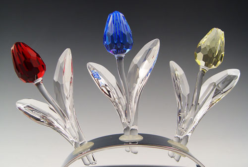 4 PIECE GROUP OF SWAROVSKI ROSES IN BOXES: To include 2 red, one blue, one yellow, One Red rose box also contains 9 small roses in sealed bag. Note damage on red rose. Largest box measures 2 3/4'' x 9 1/2'' x 3 1/2''