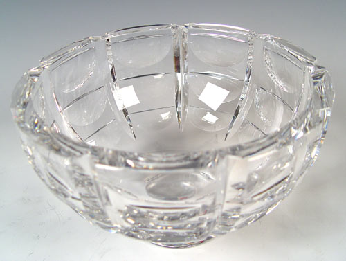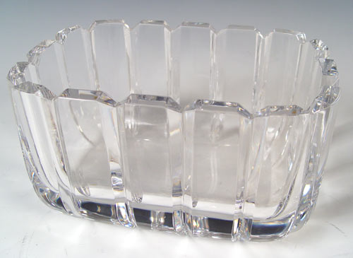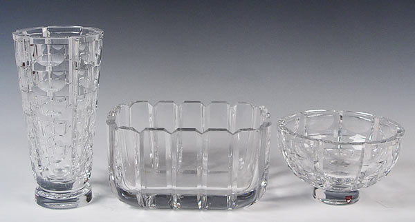 3 PIECE ORREFORS CRYSTAL BOWLS AND VASE: Heavy crystal to include 1) Vase, measures 11'' high x 5 5/8''. 2) Matching centerbowl to vase, measures 5'' high x 8 3/8'' dia. 3) Rectangular centerbowl, measures 5 1/2'' high x 10 1/2'' x 7 3/8''.
