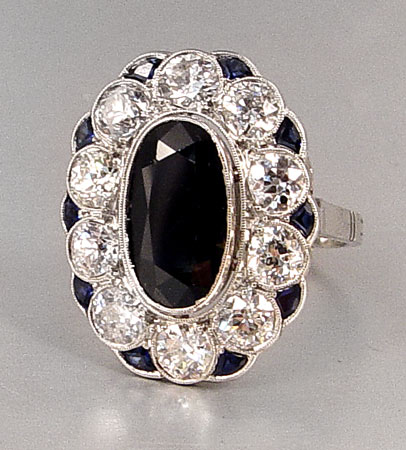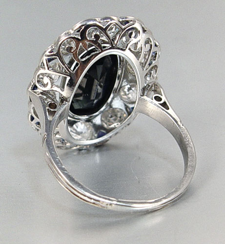 5 CT SAPPHIRE & PLATINUM RING WITH DIAMONDS: Platinum ring centering an approx. 5.04 CT sapphire rated SI in clarity (Type II), stgB in Hue, 8-9 tone and 2-3 in Saturation. Set with ten old European round cut diamonds, total weight approx. 4.00 Ct., rated SI2-I1 in clarity and G-J in color, and ten scallop shaped faceted synthetic sapphires. The sapphires and diamonds are bezel set. Weight: 8.8 grams. Size 8.5. Sold with current Florida Diamond Appraisers GIA graduates appraisal for $14,850. Est. $3500/5000**