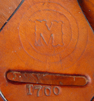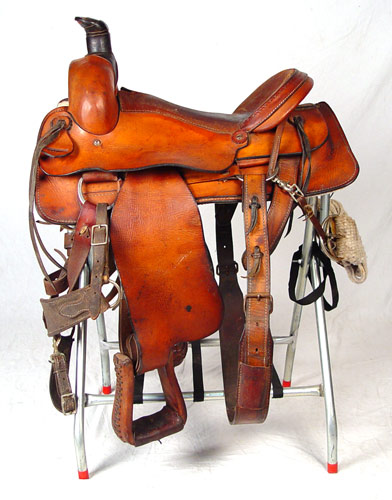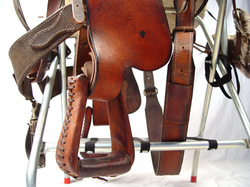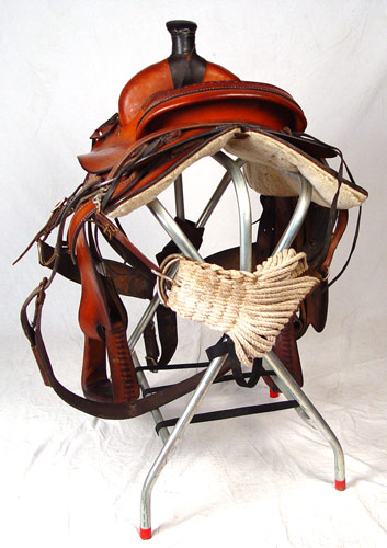 CIRCLE M FULL SIZE RIDING SADDLE: Marked with circle M, serial number 1700. Well ridden and used condition. Measures 38'' high from top of horn to bottom of stirrup x 28'' long x 24'' across. Sold with metal saddle rack.