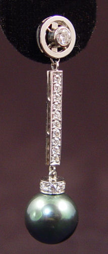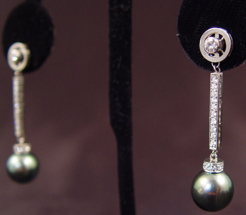 PLATINUM CULTURED TAHITIAN BLACK PEARL & DIAMOND EARRINGS: Custom crafted platinum earrings contain 36 round brilliant cut DIAMONDS Weight: 1.10 Ct. Approx., rated VS in clarity and G-H in color. From the diamonds hang 2 round 11.00 mm black Tahitian cultured pearls, Green overtone, High Luster. The diamonds are bead set. The pearls are peg set. 1 3/4'' long. Weight: 9.0 grams. Est. $2500/3500**