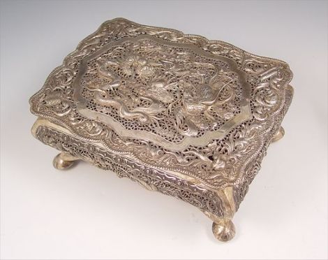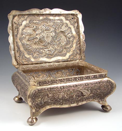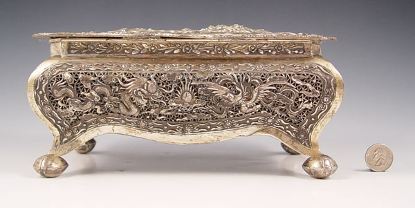 LARGE CHINESE RETICULATED SILVER BOX: Rectangular form with ball feet. The overhanging shaped and hinged lid in a repousse dragon and phoenix bird design, the Bombay sides repeating the same motif. Undecipherable numbers on the underside, actual silver content unknown. 4 3/4'' x 9 3/4'' x 7 1/4''.