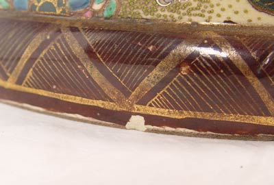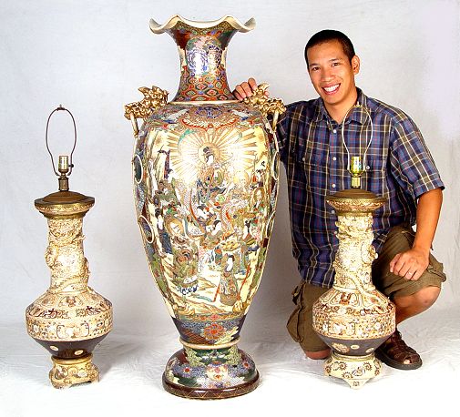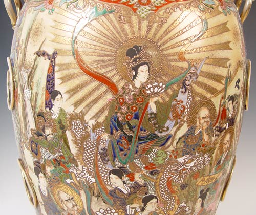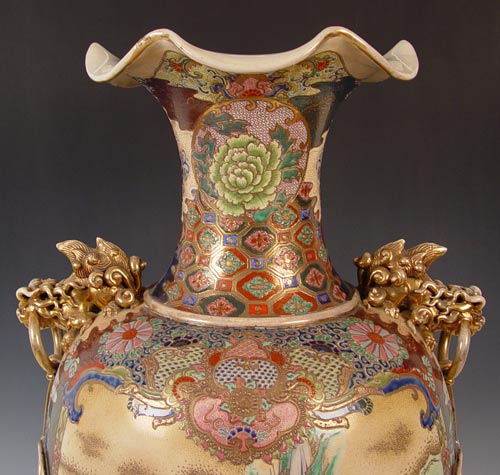 JAPANESE SATSUMA EARTHENWARE PALACE SIZE VASE: 48'' tall, flared rims, foo dog handles, small chip on underside of base.