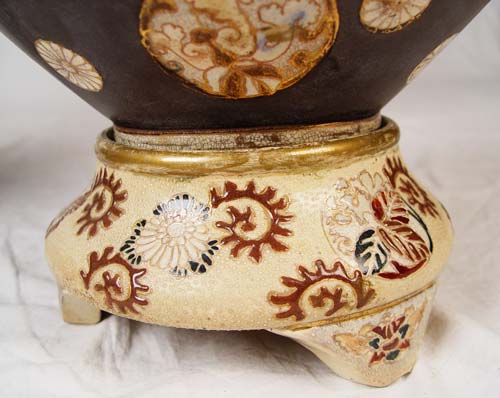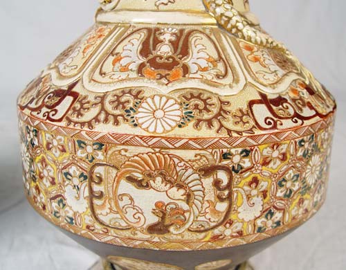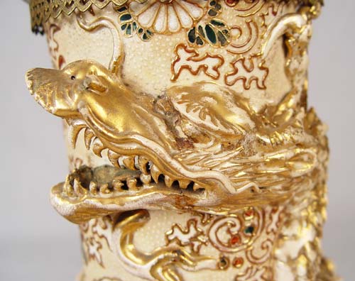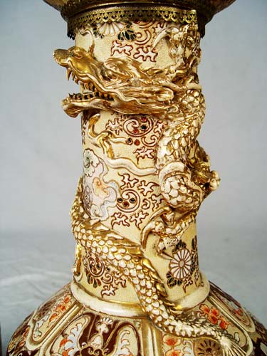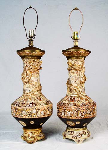 PAIR JAPANESE SATSUMA EARTHENWARE VASES MOUNTED AS TABLE LAMPS: Dragon design vases on stands, the earthenware portion is 25'', the lamps are 37'' high overall.