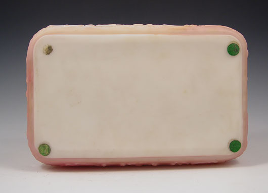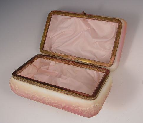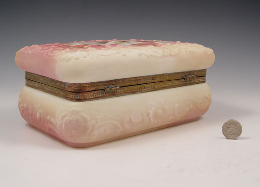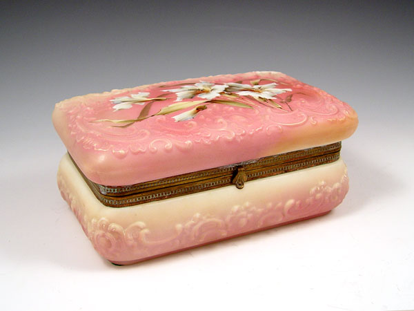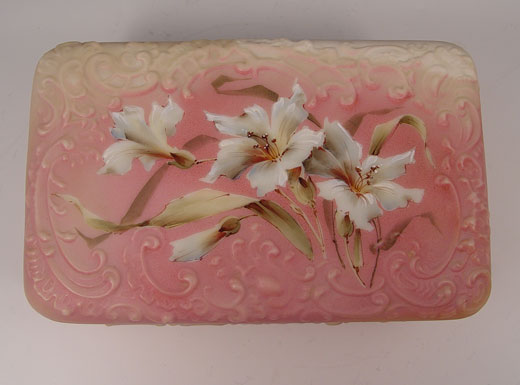 CF MONROE NAKARA HANDKERCHIEF BOX: White lily design framed by blown out rococo swirls. Featured on page 90 of John Shumans American Art Glass 2nd Edition. 4 1/2'' high x 7 1/2'' wide. Angela Hudock collection.