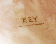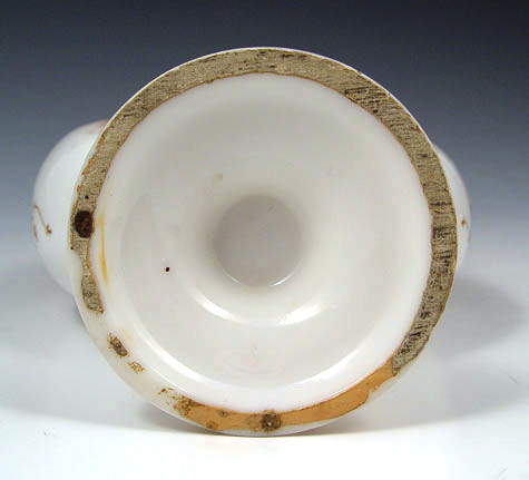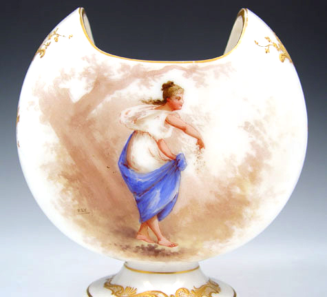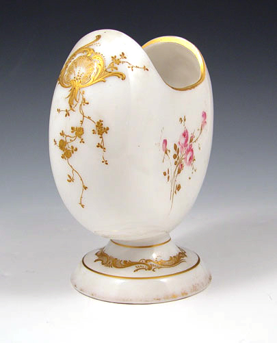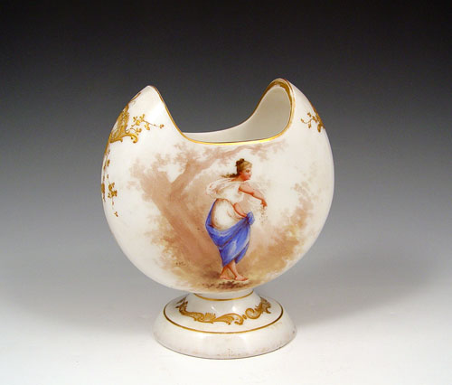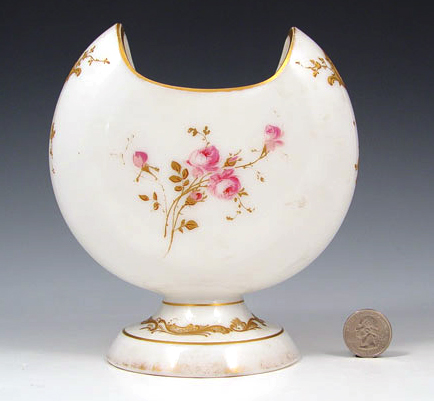 MOUNT WASHINGTON COLONIAL WARE ART GLASS VASE: Crescent shaped shiny opal glass vase featuring the figure of a woman on front side, floral spray verso. 6 3/4''h. 6'' wide. Note wear to gold rim. Angela Hudock collection.