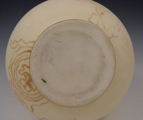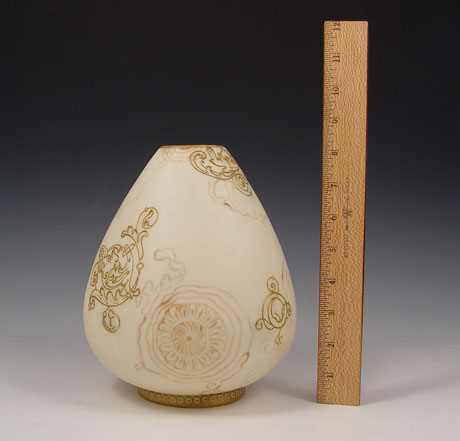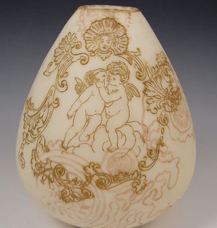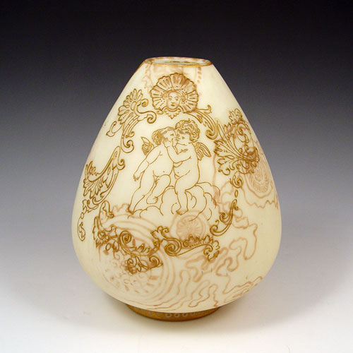 MT WASHINGTON CROWN MILANO VASE WITH CHERUBS: Raised gold design of Cupids, with muted in the glass scroll design. 8''h. Unsigned. Some wear to the gold on the rim. This is the actual vase photographed in John Shumans American Art Glass, 2nd Edition, page 105. Angela Hudock collection.