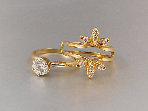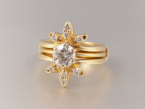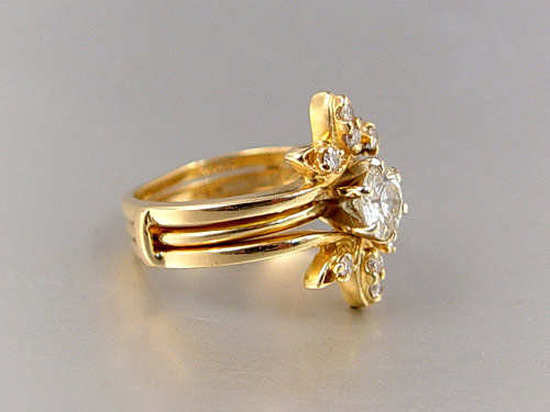 DIAMOND ENGAGEMENT RING WITH DIAMOND JACKET: 14k yellow gold solitaire ring prong set with a .82 transitional round brilliant cut diamond, I color and VS1 clarity, 2.3 grams. With a 14k yellow gold insert ring containing 8 round brilliant cut diamonds, .15ctw, H-I color and SI clarity, 5.1 grams. Sold with a Dec 2007 Florida Diamond Appraisers Graduate Gemologist (GIA) appraisal, $4595 retail replacement value.
