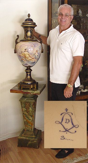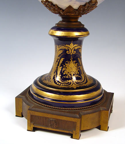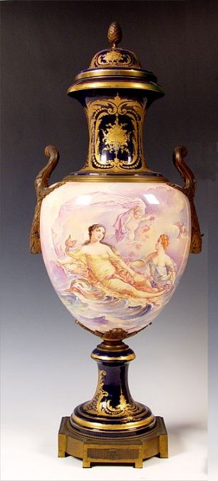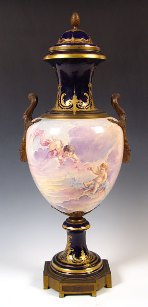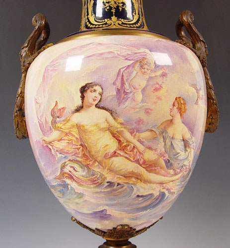 MONUMENTAL SEVRES PALACE URN: Early 19th C. Continuous scene on the body of urn, signed C. Rochelle. 3 part construction, with gilt enhancements on the deep cobalt upper and lower sections. The lid bears the Serves mark. Please note normal wear to the gold and old small chip on the underside of the lid and on the cobalt portion of the neck. 35 1/2'' high, body approx. 15'' x 13''. Est. $9000/12000**