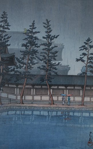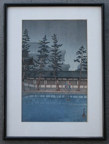HASUI, Kawase, (Japan, 1883-1957): Great Buddha Hall, Woodblock, 14 3/4'' x 9'' sight size, 15 1/4'' x 10 1/2'' with margins, signed lower right, encased in black frame, 18 1/2'' x 13 3/4''. Condition - Some browning visible in upper margin.