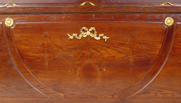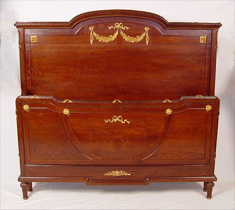 FRENCH EMPIRE STYLE ORMOLU BED: Oak with applied ormolu decoration (not original), call about rails. Headboard measures 59 1/4'' high x 62 1/2'' wide. Footboard measures 34 1/2'' high.