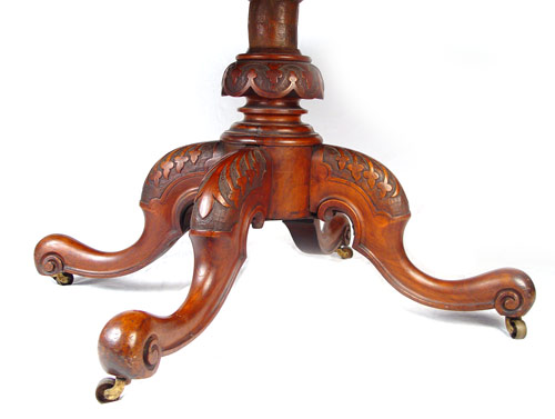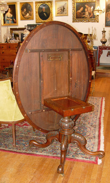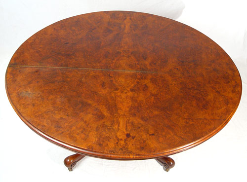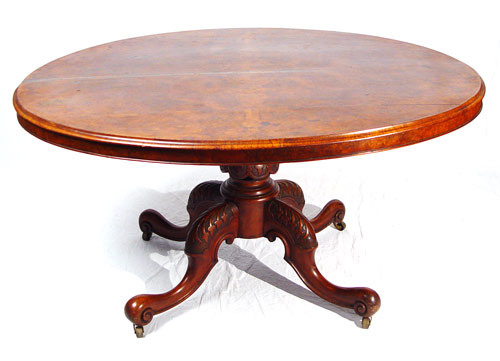 19th C REGENCY OVAL TILT TOP BREAKFAST TABLE: Richly burled veneer top on a carved columnar pedestal with four acanthus leaf carved legs ending in scroll feet. Castors are intact. 29''h. x 44 1/2'' x 58''.