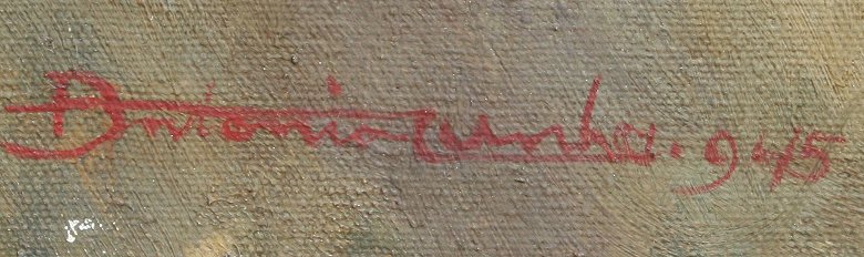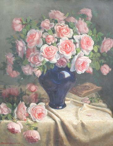 ILLEGIBLY SIGNED FLORAL OIL/CANVAS STILL LIFE: 32'' x 25 1/2'', dated 1945, signed Antonio Cunho?, unframed. Condition - Needs cleaning, several very minor abrasions.