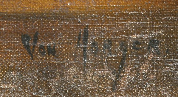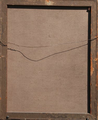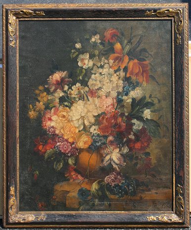 DUTCH? FLORAL STILL LIFE PAINTING: 30'' x 24'', illegible signed, gilded and painted carved frame with wear, 34 1/2'' x 28 1/2''. Condition - Some stretcher bar wear and paint loss, needs re-lined, repair to tear in center of painting and cleaning.