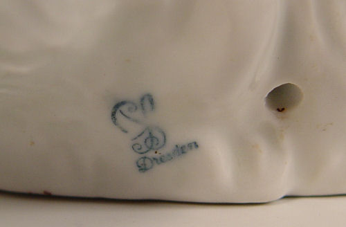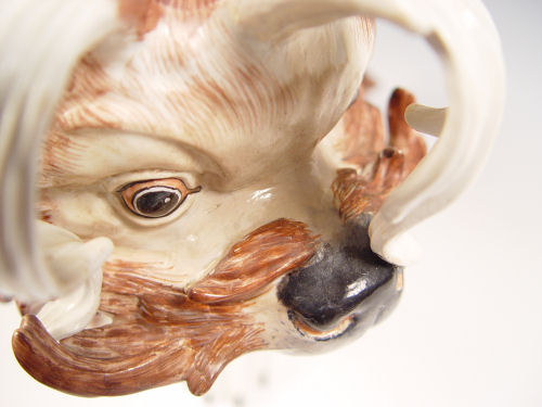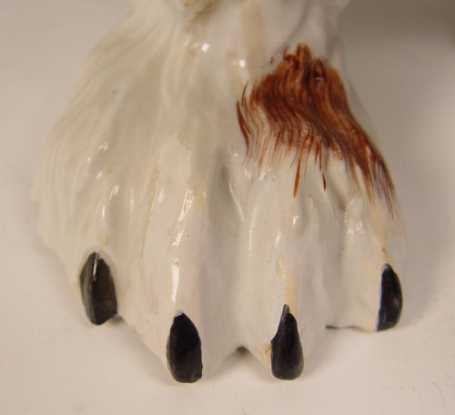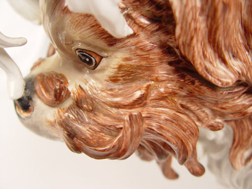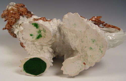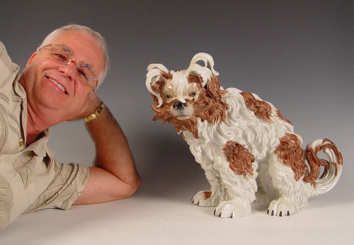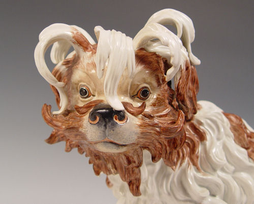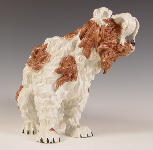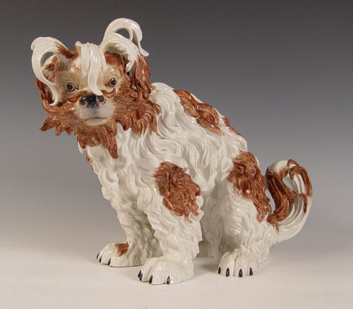 DRESDEN MODEL OF A BOLOGNESE LION DOG: Carl Thieme Dresden. 15'' tall, 20'' long, approx. 9'' wide. Please note professional repairs and visible repaired cracks to feet, maybe more, please examine closely.