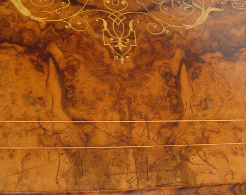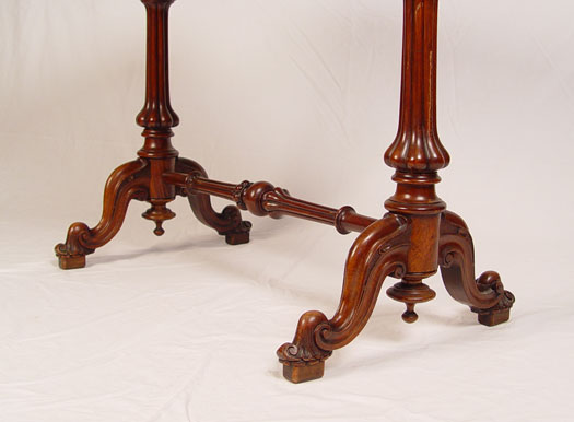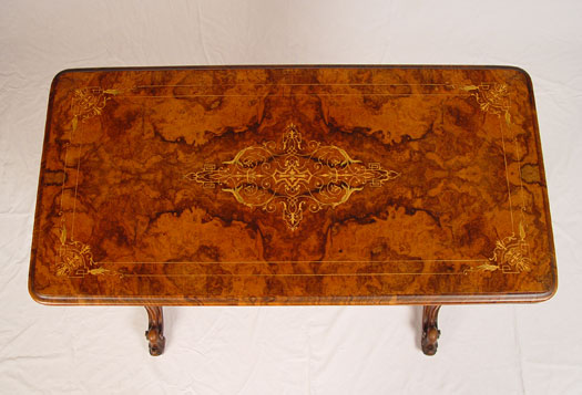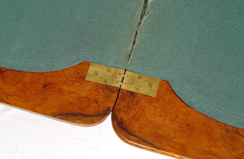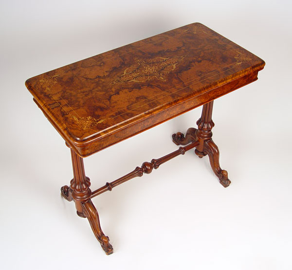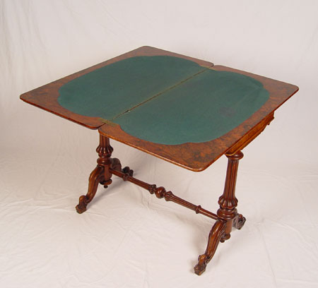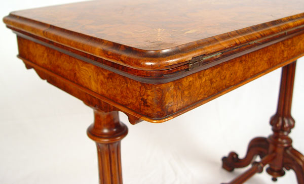 HIGH VICTORIAN BURLED GAME TABLE: Herter Bros. attribution. Victorian period inlay table, flip and swing top with felt on the underside. Two pedestal legs joined by a carved stretcher. 29'' high x 26 1/2'' wide x 18''.