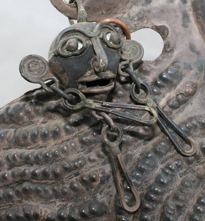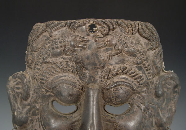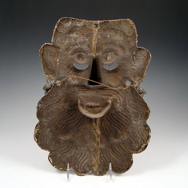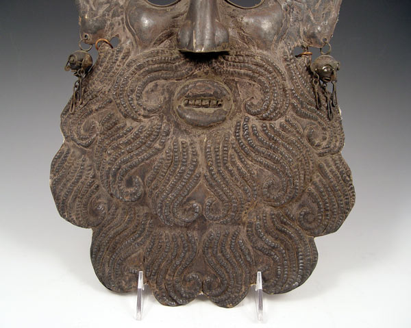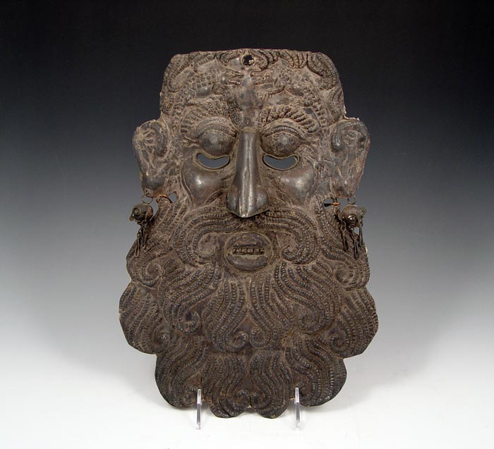 RARE MEXICAN RAIN-PETITIONING MASK CIRCA 1900: Believed to be composed of silver, from the LA Parota region, with embossed crocodile designs in the forehead, and monkey motif earrings, measures 13 3/4'' x 10''. Reference ''Mexican Masks'', by Donald Cordry, pp. 19. Est. $1500/2500**