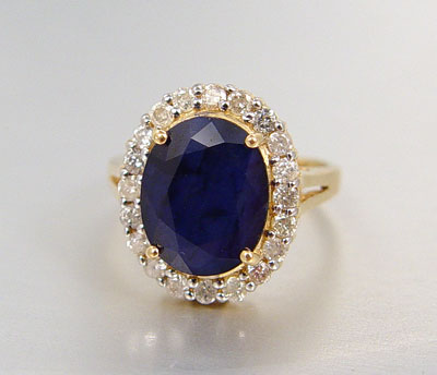 14K 5.75 CT. SAPPHIRE & .50 CT. DIAMOND RING: 14K yellow gold ring centers one oval shaped mixed cut sapphire. Weight: 5.75 Ct. Approx. SI2 in clarity (Type II), B in Hue, 8 in Tone and 3 in Saturation. 20 round full cut diamonds. Weight: .50 Ct. Approx. Rated I1-I2 in clarity and J-K-L in color. The sapphire and diamonds are prong set. Weight 5.7 grams. Size 7
