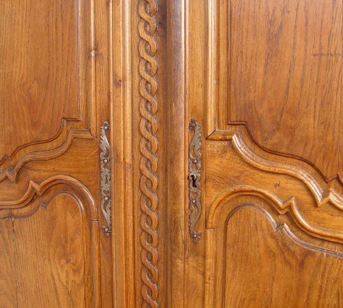 19th C FRENCH PROVINCIAL CABINET: Carved and molded walnut two door cupboard. Interior fitted with a later divider and shelves, all of which are removable. Peg construction. 73 1/2'' high x 55 1/4'' wide x 25 1/4'' deep.