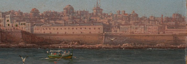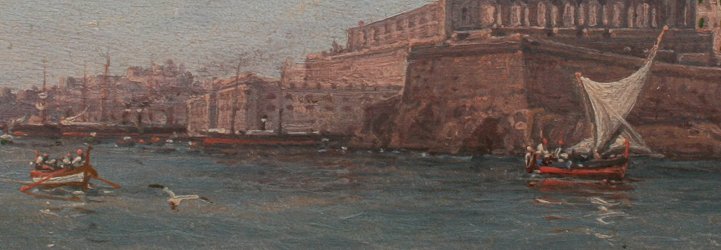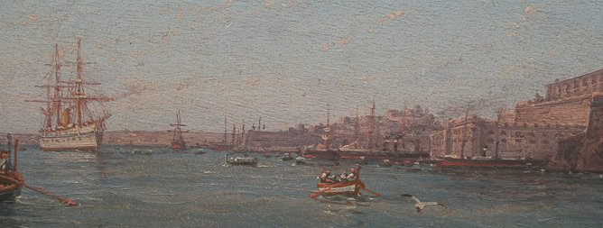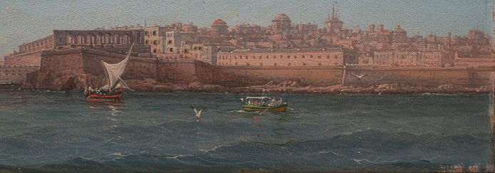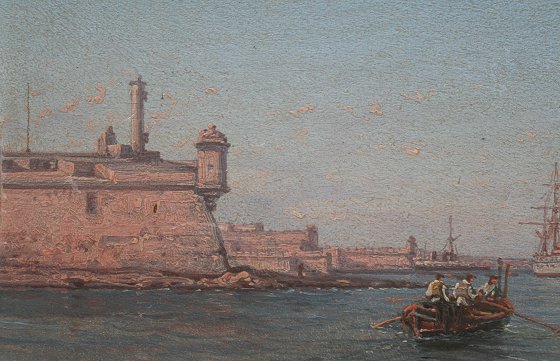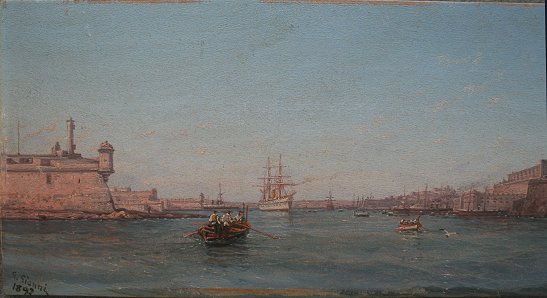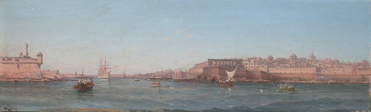 GIANNI, Gerolamo, (Italian, 1837-?): View of Malta, Grand Harbour, Oil/Wood Panel, 6 1/8'' x 20 1/8'', signed and dated 1892, titled verso ''Grand Harbour'', framed, 10'' x 24''. Small area of frame rub in lower margin. Est. $8000/12000**