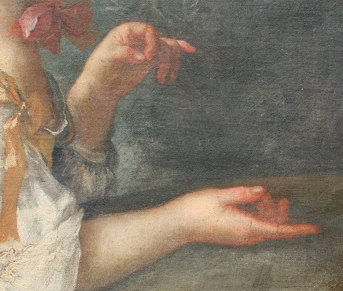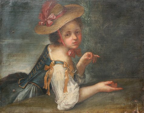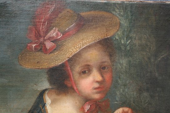 MUSEUM QUALITY 18/19TH CENTURY PAINTING OF A YOUNG MAIDEN IN A BONNET, OIL/C: 22 1/2'' x 28 1/2'', no visible signature, much later frame, 31'' x 36 1/2''. Condition - Has been re-lined, scattered restoration visible, needs cleaning. Est. $3000/5000**