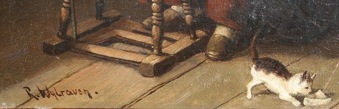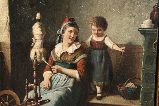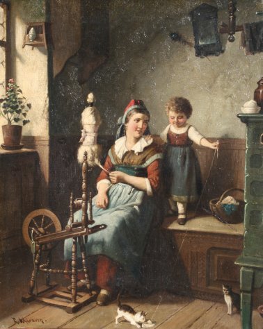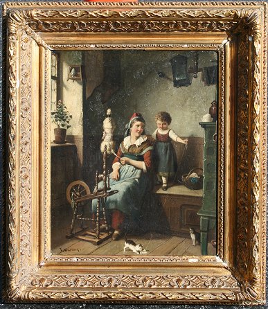 19TH CENTURY DUTCH SCHOOL OIL/C: Genre scene of a mother spinning wool with a child playing with kittens. In the style of Walraven, 17 1/2'' x 14 1/2'', elaborate 19th C gilded gesso frame with wear and missing gesso, 25'' x 22''. Condition - Several minor flecks. Est. $1500/2500**