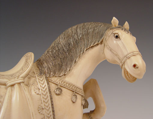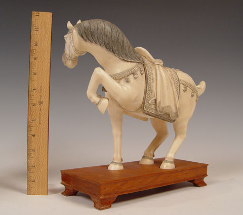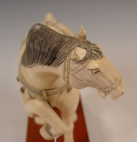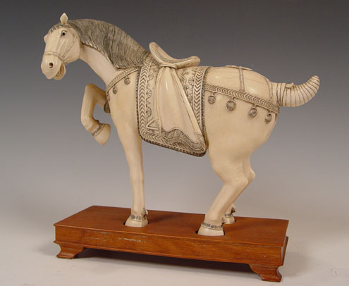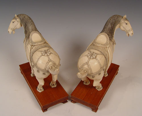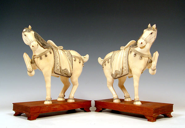 PAIR OF CHINESE CARVED IVORY HORSES: Pair of prancing horses, approx. 10''h. x 12'' long. Measurement excludes the custom wood bases. Please note repair on one ear.