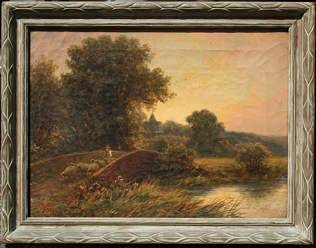 FENSON, R., (English, 19th/20th C): Shepherd and his flock crossing a stone bridge at sunset, OIL/C, 12'' x 16'', signed lower left, dated '70, carved frame with wear, 14 1/2'' x 18 1/2''. Condition - Scattered cracklure, several small patches visible verso, small tear in center. Est. $400/600**