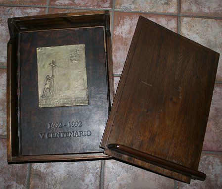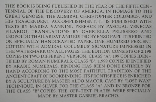 LIMITED EDITION HOMAGE TO THE ADMIRAL CHRISTOPHER COLUMBUS: ''Published with text by Marisa Vannini, printed on specially hand crafted paper of 100% cotton with Columbus' signature impressed in the water mark on all pages. The frontispiece is enriched by a sculpture by master Aldo Macor in silver. The off-text prints were specially made by master Gabriel Bracho. The edition consists of 2198 copies in two different versions: The Class A, which this is, are 195 copies identified by Roman numerals.'' Above as stated on page VII of the book. It is bound in leather, with a custom case/stand #42. Book measures 19 1/2'' x 14'' x 3 1/8'', case measures 23'' x 16 1/2'' x 7''. Est. $400/600**