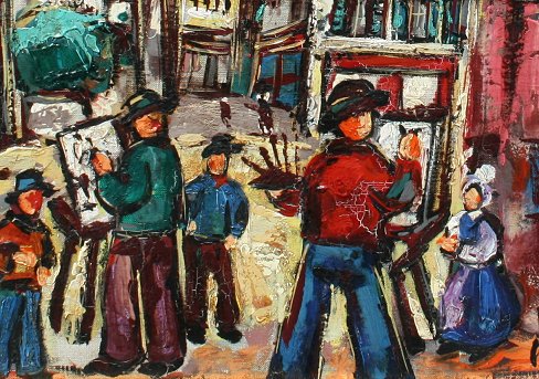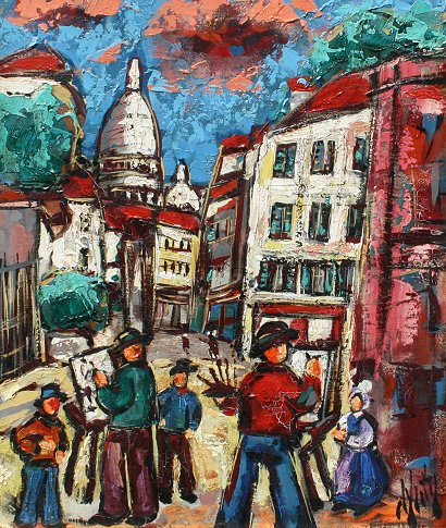 D'ANTY, Henry, (French, 1910-): Parisian Street Scene with figures, titled La Rue Morvins, Oil/Canvas, 21 1/2'' x 18'', signed, titled and signed verso, stamp from D'Anty Atelier, encased in gilded frame, 25 1/2'' x 22''. Condition - Mild cracklure, very light.